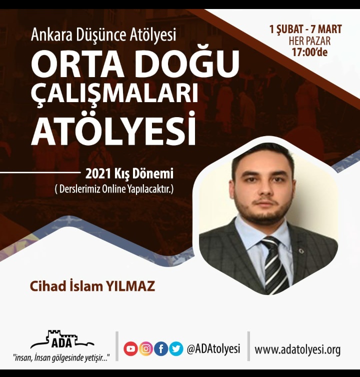 Ankara Düşünce Atölyesi bünyesinde Ortadoğu Çalışmaları Atölyemiz 7 Şubat tarihinde başlıyor. Beraber öğreneceğimiz güzel bir program planladık. Derslerimiz her pazar saat 17:00’da online olarak yapılacaktır.