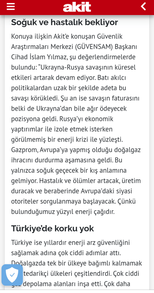 Avrupa’da yaşanan enerji krizi ile ilgili Yeni Akit Gazetesine vermiş olduğum röportaj için Tıklayınız